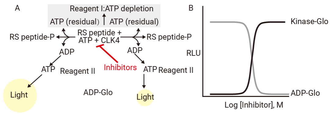 图 3. (A) ADP-Glo 检测原理;(B) 发光反应信号 (RLU) 与 ATP 耗竭实验 (Kinase-Glo测定) 中的激酶活性成反比,与 ADP-Glo 测定中的激酶活性成正比[5]。