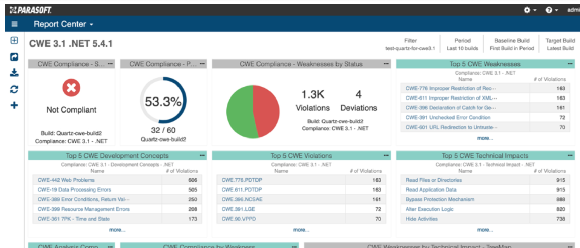 扩展了Parasoft对最重要的.NET安全标准的支持,完全支持OWASP Top 10以及对业界最广泛的CWE支持。这种全面的支持使团队能够在其软件质量流程中建立安全性,直接在Visual Studio中执行深层代码分析,以及通过命令行界面和CI插件。