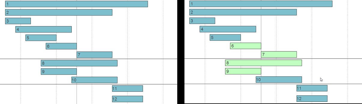 然而,在几乎任何情况下,甘特图都不像上面那样简单。通常,要标记的元素有自己的颜色来表示特定的语义。然后标记颜色将隐藏“语义颜色”。因此,用户可能会丢失关于标记元素的重要信息。