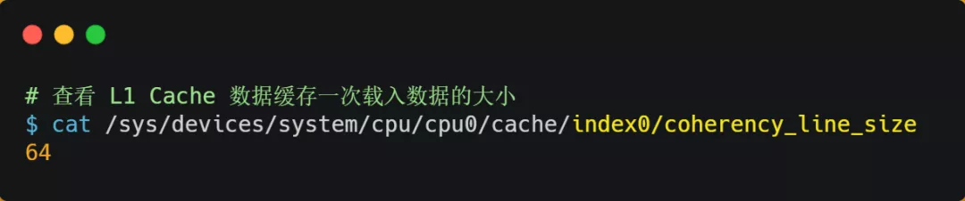 至于 CPU Line 大小,在 Linux 系统可以用下面的方式查看到,你可以看我服务器的 L1 Cache Line 大小是 64 字节,也就意味着 L1 Cache 一次载入数据的大小是 64 字节。