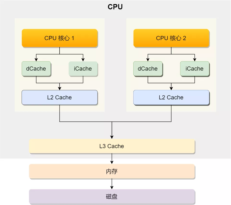 可以看到,一个 CPU 里通常会有多个 CPU 核心是,比方上图中的 1 号和 2 号 CPU 核心,并且每个 CPU 核心都有自己的 L1 Cache 和 L2 Cache,而 L1 Cache 通常分为 dCache(数据缓存) 和 iCache(指令缓存),L3 Cache 则是多个核心共享的,这就是 CPU 典型的缓存层次。