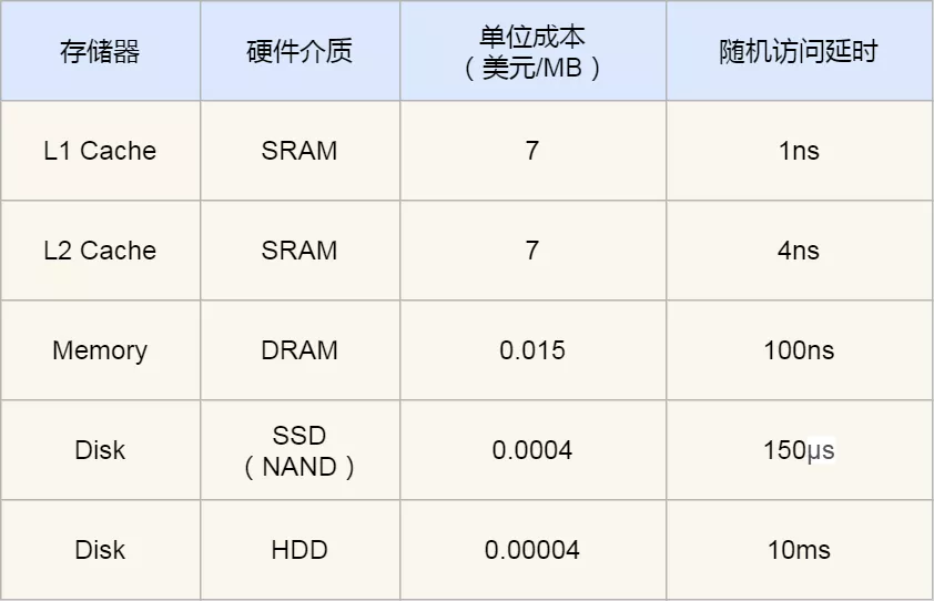 从上图也可以看到,从上往下,存储设施的容量会越大,而访问速度会越慢。至于每个存储设施的访问延时,你可以看下图的表格: