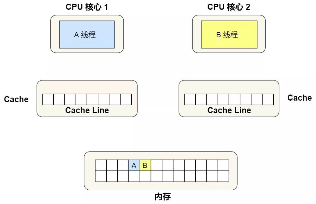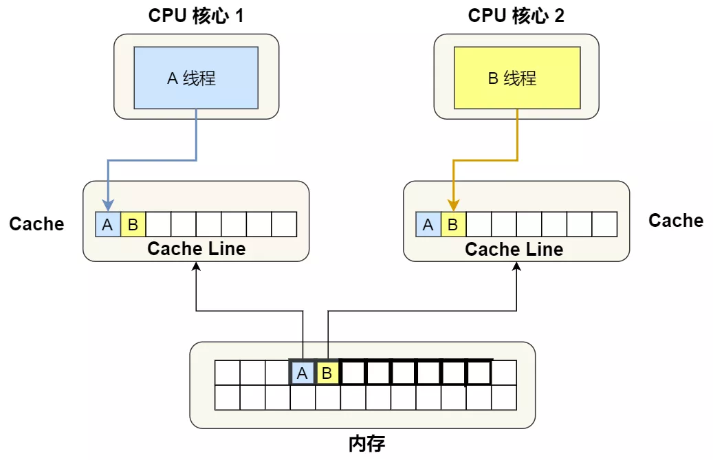 现在假设有一个双核心的存在 CPU,这两个 CPU 核心并行运行着两个不同的线程,它们同时从内存中读取两个不同的数据,分别是类型为 long 的变量 A 和 B,这个两个数据的地址在物理内存上是连续的,假如 Cahce Line 的大小是 64 字节,并且变量 A 在 Cahce Line 的开头位置,那么这两个数据是位于同一个位置 Cache Line 中,又由于 CPU Line 是 CPU 从内存读取数据到 Cache 的单位,所以这两个数据会被同时读入到了两个 CPU 核心中各自 Cache 中。