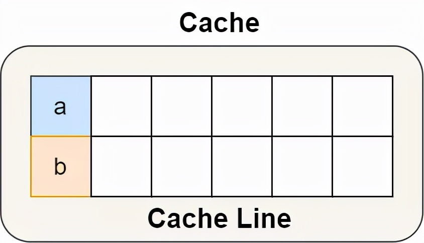 结构体里的两个成员变量 a 和 b 在物理内存地址上是连续的,于是它们可能会位于同一个 Cache Line 中,如下图: