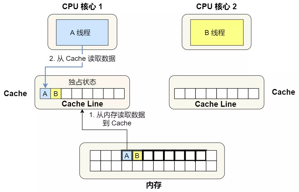 ②. 1 号核心读取变量 A,因为 CPU 从内存读取数据到 Cache 的单位是 Cache Line,也正好变量 A 和 变量 B 的数据归属于同一个 Cache Line,所以 A 和 B 的数据都会被加载到 Cache,并将此 Cache Line 标记为「独占」状态。