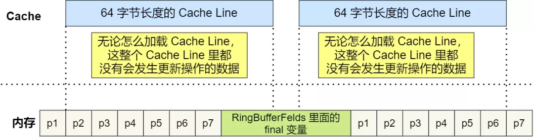 根据 JVM 对象继承关系中父类成员和子类成员,内存地址是连续排列布局的,因而 RingBufferPad 中的 7 个 long 类型数据作为 Cache Line 前置填充,而 RingBuffer 中的 7 个 long 类型数据则作为 Cache Line 后置填充,这 14 个 long 变量没有任何实际用途,更不会对它们进行读写操作。