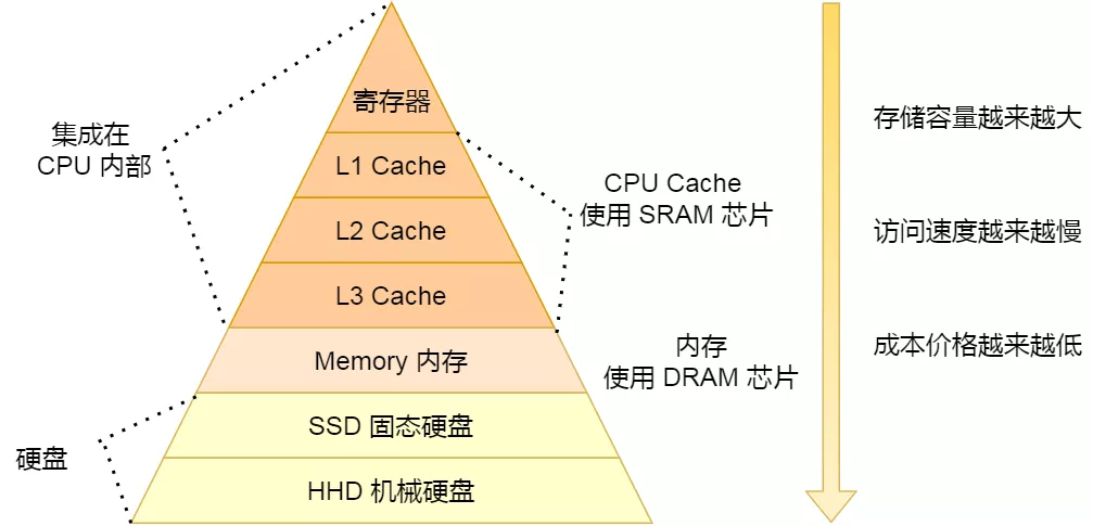 上面提到的都是 CPU 内部的 Cache,放眼外部的话,还会有内存和硬盘,这些存储设施共同构成了金字塔存储层次。如下图所示: