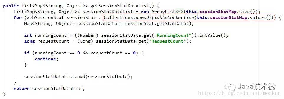java.util.ConcurrentModificationException at java.util.LinkedHashMap$LinkedHashIterator.nextEntry(LinkedHashMap.java:394) at java.util.LinkedHashMap$ValueIterator.next(LinkedHashMap.java:409) at java.util.Collections$UnmodifiableCollection$1.next(Collections.java:1067) at com.alibaba.druid.support.http.stat.WebAppStat.getSessionStatDataList(WebAppStat.java:504) at com.alibaba.druid.support.http.stat.WebAppStatUtils.getSessionStatDataList(WebAppStatUtils.java:64) at com.alibaba.druid.support.http.stat.WebAppStatManager.getSessionStatData(WebAppStatManager.java:100) at com.alibaba.druid.stat.DruidStatService.getWebSessionStatDataList(DruidStatService.java:205) at com.alibaba.druid.stat.DruidStatService.service(DruidStatService.java:161) at com.alibaba.druid.support.http.StatViewServlet.process(StatViewServlet.java:162) at com.alibaba.druid.support.http.ResourceServlet.service(ResourceServlet.java:253)