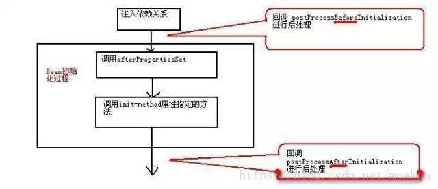 容器中一旦注册了Bean后处理器,Bean后处理器就会自动启动,在容器中每个Bean创建时自动工作,Bean后处理器两个方法的回调时机如下图