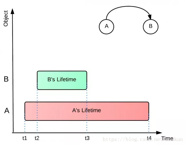 让我们来看看下面的例子,看看为什么发生内存泄漏。在下面的例子中,对象A是指对象B。A的生命周期(t1 - t4)比B的(t2 - t3)长得多,当应用中不再使用B时,A仍然有一个B的引用,这样垃圾收集器就不能从内存中删除B。这就可能会导致内存不足的问题,因为如果A同时为更多的对象做同样的事情,那么会有很多像B这样的对象没有收集并占用内存空间。