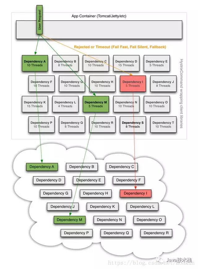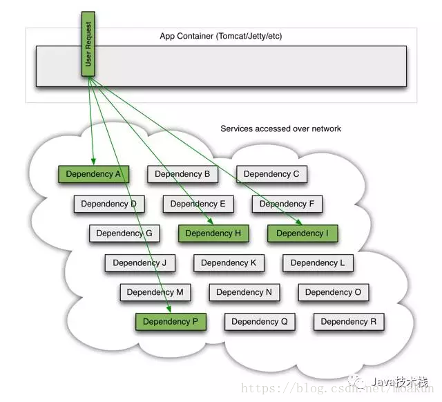 在大中型分布式系统中,通常系统很多依赖(HTTP,hession,Netty,Dubbo等),如下图: