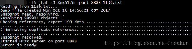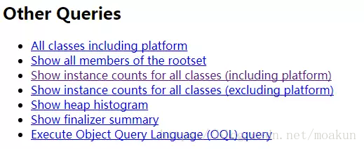 jhat -J-Xmx512m -port 8888 1136.txt命令生成分析报告,可通过http访问。