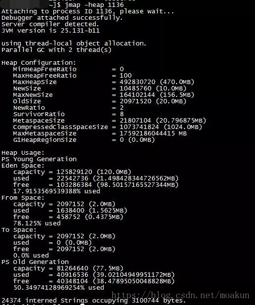 jmap -heap <pid> 查看堆使用情况。