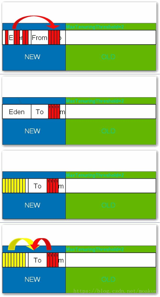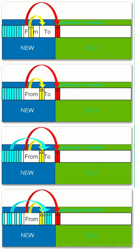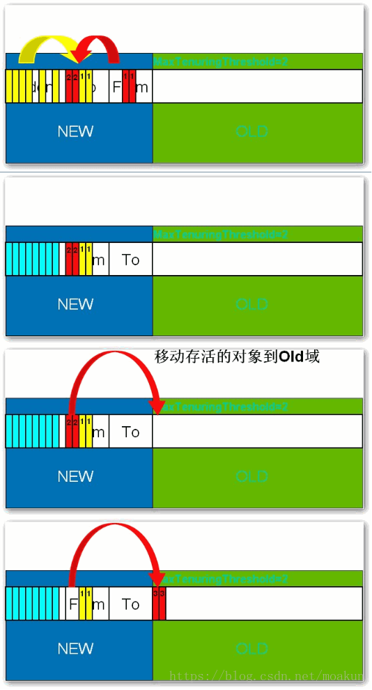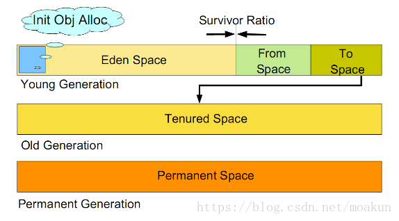 所有新生成的对象首先都是放在年轻代的。年轻代的目标就是尽可能快速的收集掉那些生命周期短的对象。年轻代分三个区。一个Eden区,两个Survivor区(一般而言)。大部分对象在Eden区中生成。当Eden区满时,还存活的对象将被复制到Survivor区(两个中的一个),当这个Survivor区满时,此区的存活对象将被复制到另外一个Survivor区,当这个Survivor去也满了的时候,从第一个Survivor区复制过来的并且此时还存活的对象,将被复制“年老区(Tenured)”。需要注意,Survivor的两个区是对称的,没先后关系,所以同一个区中可能同时存在从Eden复制过来 对象,和从前一个Survivor复制过来的对象,而复制到年老区的只有从第一个Survivor去过来的对象。而且,Survivor区总有一个是空的。同时,根据程序需要,Survivor区是可以配置为多个的(多于两个),这样可以增加对象在年轻代中的存在时间,减少被放到年老代的可能。