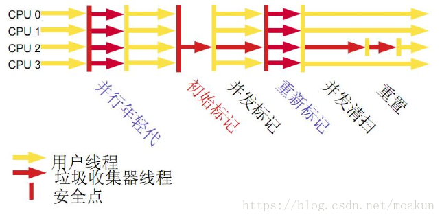 并发收集器主要减少年老代的暂停时间,他在应用不停止的情况下使用独立的垃圾回收线程,跟踪可达对象。在每个年老代垃圾回收周期中,在收集初期并发收集器 会对整个应用进行简短的暂停,在收集中还会再暂停一次。第二次暂停会比第一次稍长,在此过程中多个线程同时进行垃圾回收工作。