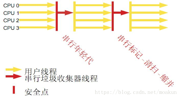 并发收集器使用处理器换来短暂的停顿时间。在一个N个处理器的系统上,并发收集部分使用K/N个可用处理器进行回收,一般情况下1<=K<=N/4。