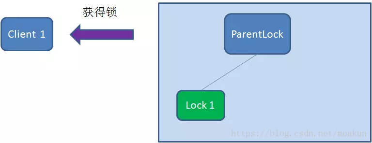 首先,在Zookeeper当中创建一个持久节点ParentLock。当第一个客户端想要获得锁时,需要在ParentLock这个节点下面创建一个临时顺序节点 Lock1。