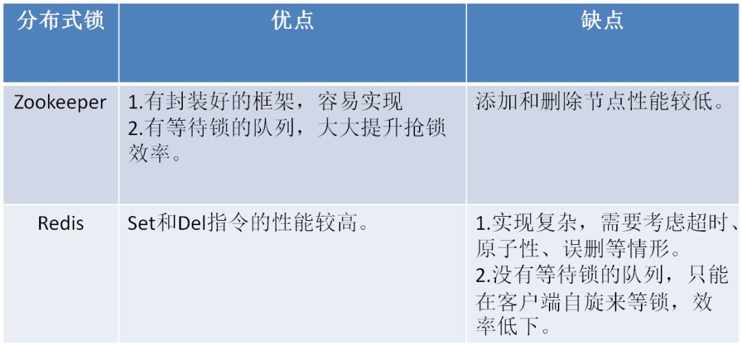 下面的表格总结了Zookeeper和Redis分布式锁的优缺点: