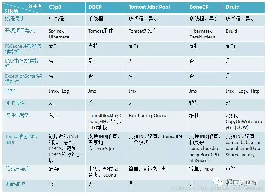 本文所比较的5种数据库连接池在性能方面,根据个人测试结果和参考网上资料Druid > TomcatJDBC > DBCP > C3P0,BoneCP的性能方面没有深入比较,应该和Tomcat Jdbc差不多。