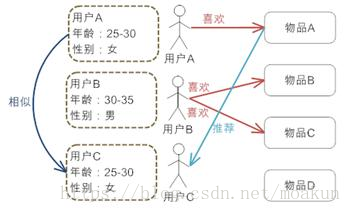 系统首先会根据用户的属性建模,比如用户的年龄,性别,兴趣等信息。根据这些特征计算用户间的相似度。比如系统通过计算发现用户A和C比较相似。就会把A喜欢的物品推荐给C。