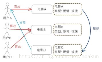 系统首先对物品(图中举电影的例子)的属性进行建模,图中用类型作为属性。在实际应用中,只根据类型显然过于粗糙,还需要考虑演员,导演等更多信息。通过相似度计算,发现电影A和C相似度较高,因为他们都属于爱情类。系统还会发现用户A喜欢电影A,由此得出结论,用户A很可能对电影C也感兴趣。于是将电影C推荐给A。