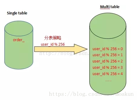 假设有一张表记录用户购买信息的订单表order,由于order表记录条数太多,将被拆分成256张表。
