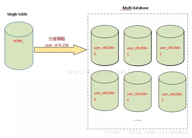 拆分的记录根据user_id%256取得对应的表进行存储,前台应用则根据对应的user_id%256,找到对应订单存储的表进行访问。