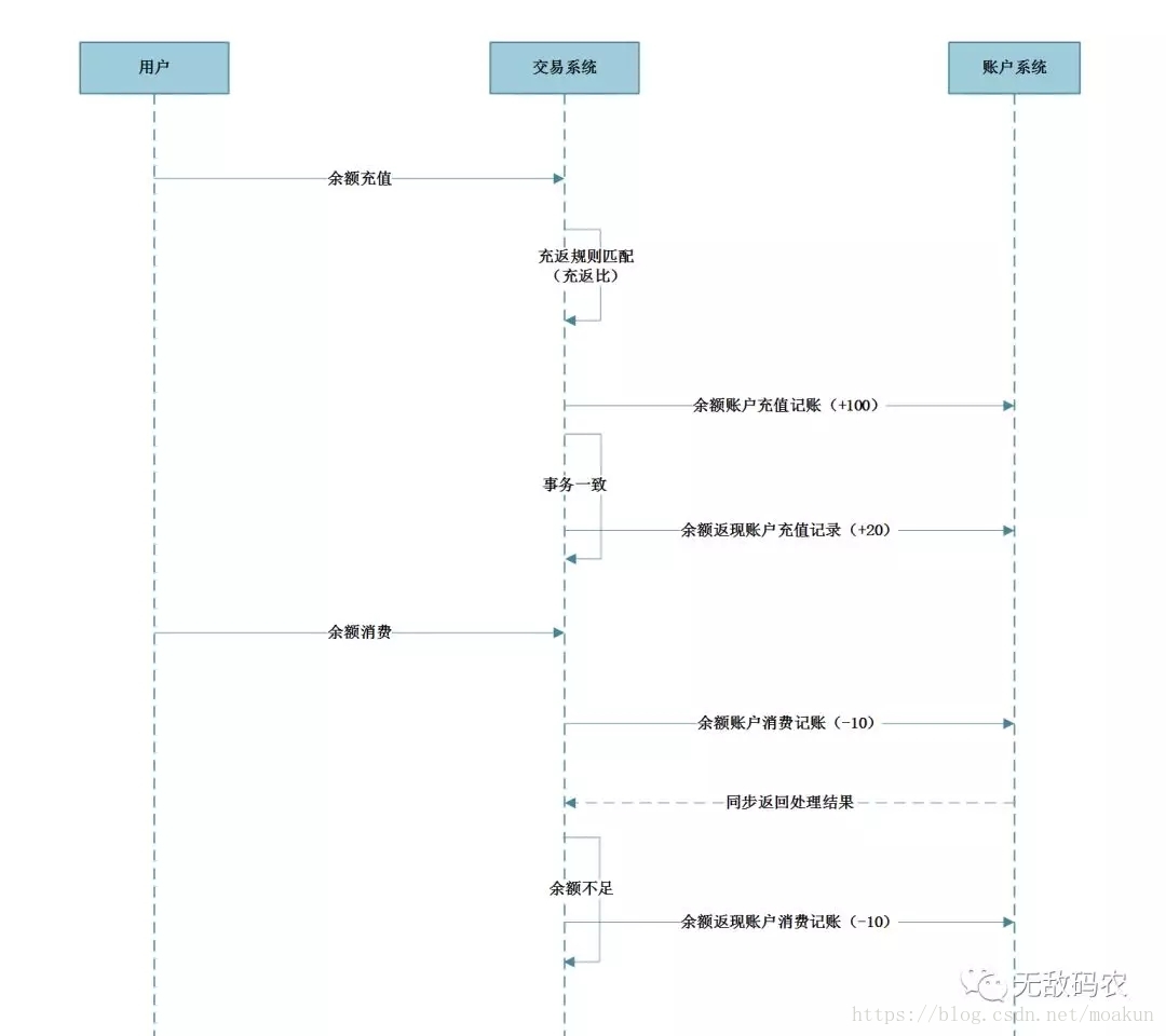 显然,这样还不能让逻辑完全运行起来,因为增加了账户相应地交易逻辑与资金逻辑都需要进行相应的改变才行,以上业务场景中原来余额充值只需要调用余额账户记账一次,现在需要根据充返逻辑再调用余额返现账户记账一次;而余额消费则需要根据业务规则进行余额消费记账,假设业务规则为“余额消费优先扣减余额返现账户,再次扣减余额账户”,那么系统交易及记账逻辑如下图所示: