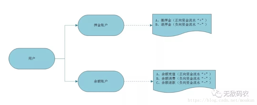 通过上述设计基本上就满足了简单的业务需求,用户缴纳押金单独存放在一个押金账户,用户的每次押金冲退都记录账户流水(缴押金记+,退押金记-);用户余额充值单独存放在一个余额账户,用户的每次余额充值、消费、退款都记录账户流水(余额充值记+、余额消费记-、余额退款记-)。