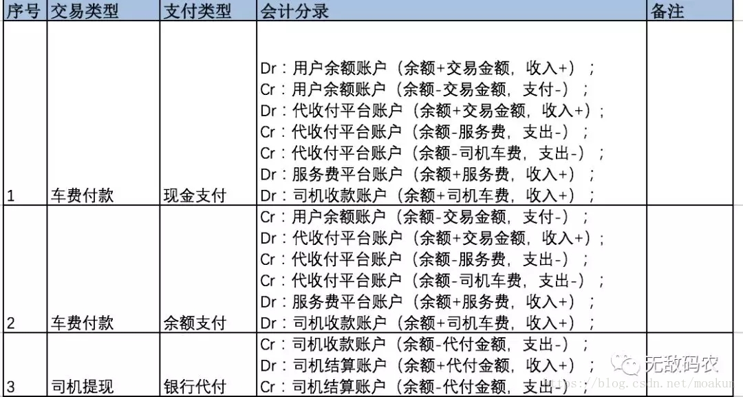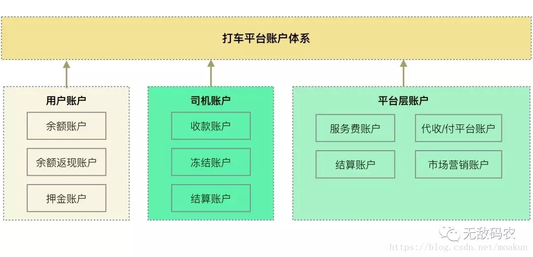 此外,为了满足产品逻辑的扩张,例如要具备冻结司机账户的业务功能,则需要设置冻结账户;平台为了进行市场营销活动,如发放红包则需要设置平台市场营销账户等。