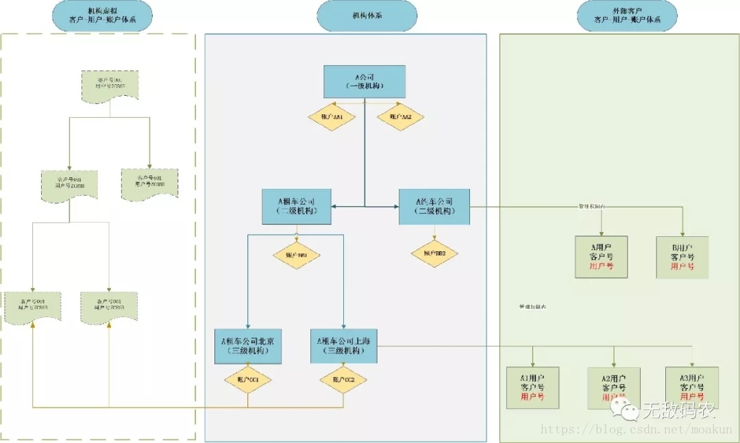 以上述模型的定义而设计的账户系统会初步形成一个具备支持多类业务账户逻辑并行的通用中台账户系统雏形,从财务角度看账户层次会相对清晰。另外,图中还定义了机构的概念以支持总公司-分公司这样具备层级关系的财务核算需求,当然这种情况在互联网公司的扁平化模式下并不常见,所以可以暂时忽略。