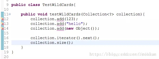 借助于无限定通配符却可以,前面讲过 ? 代表未知类型,所以它涉及的操作都基本上与类型无关,因此 jvm 不需要针对它对类型作判断,因此它能编译通过,但是,只提供了数组中的元素因为通配符原因,它只能读,不能写。比如,上面的 v 这个局部变量,它只能进行 get() 操作,不能进行 add() 操作,这个在前面通配符的内容小节中已经讲过。