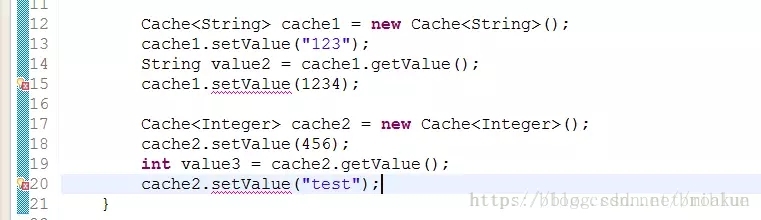 上面代码显示,无法将一个 String 对象设置到 cache2 中,因为泛型让它只接受 Integer 的类型。