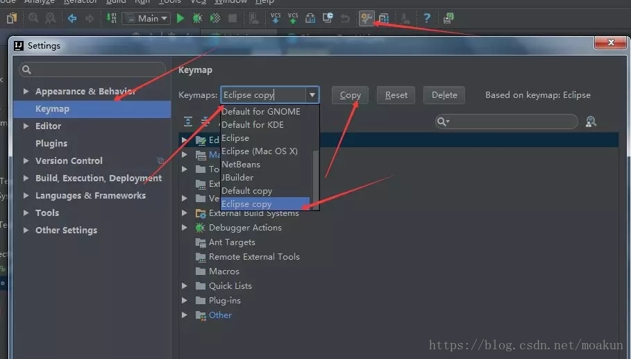这个是修改咱习惯的快捷键映射表,因为我是从eclipse转来的,估计大部分都和我差不多啦,那就可以在这配置成eclipse的快捷键映射表,那么就没有必要再去记一套快捷键映射了,比如我们常用的删除一行 Ctrl d,复制一行Ctrl + alt + 下方向。注释一行,Ctrl + / 这都是我们常用的。也是我们习惯的,这个也是极好的设置啊。点击这里查看Intellij IDEA非常6的十个姿势!
