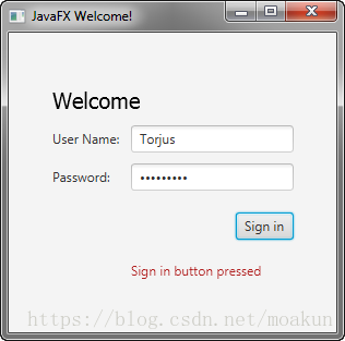 该setOnAction()方法用于注册事件处理程序,该事件处理程序将actiontarget对象设置Sign in button pressed为用户按下按钮时。actiontarget对象的颜色设置为耐火砖红色。