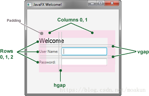 使用网格窗格时,可以显示网格线,这对于调试非常有用。在这种情况下,您可以grid.setGridLinesVisible(true)在添加密码字段的行之后添加。然后,当您运行应用程序时,您会看到网格列和行的行以及间隙属性,如图4-2所示。