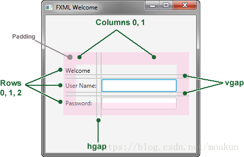 下一行创建一个Label对象,其中第User Name0列,第1行为文本,第1列为第1行TextField,右侧为对象。另一行Label和PasswordField对象以类似方式创建并添加到网格中。