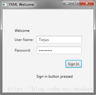 该HBox窗格有一个孩子,一个Button与text属性设置为Sign in和onAction设置属性handleSubmitButtonAction()。虽然FXML是定义应用程序用户界面结构的便捷方式,但它并未提供实现应用程序行为的方法。您可以handleSubmitButtonAction()在本教程的下一部分“ 添加代码来处理事件”中实现Java代码中的方法行为。