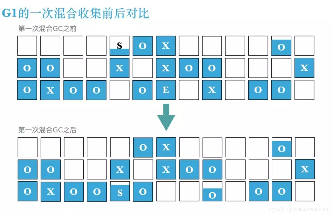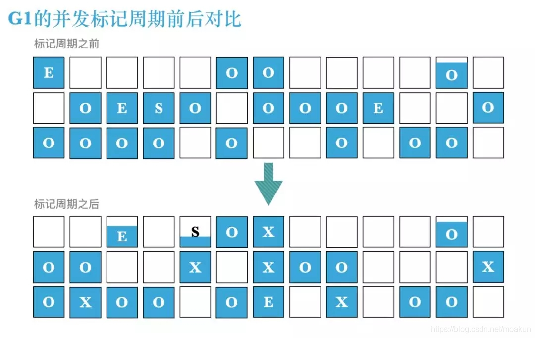 2、注意到一些分区被标记为X,这些分区属于老年代,它们就是标记周期找出的包含最多垃圾的分区(注意:它们内部仍然保留着数据);