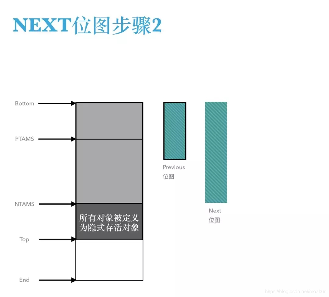 在并发周期开始之前,NTAMS字段被设置到每个分区当前的顶部,并发周期启动后分配的对象会被放在TAMS之前(图里下边的部分),同时被明确定义为隐式存活对象,而TAMS之后(图里上边的部分)的对象则需要被明确地标记。