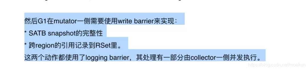 4、G1里在并发标记的时候,如果有对象的引用修改,要将旧的值写到一个缓冲区中,这个动作前后会有一个write barrier,这段可否细说下?