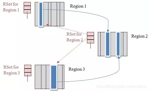 如下图所示,Region1和Region3中的对象都引用了Region2中的对象,因此在Region2的RSet中记录了这两个引用。
