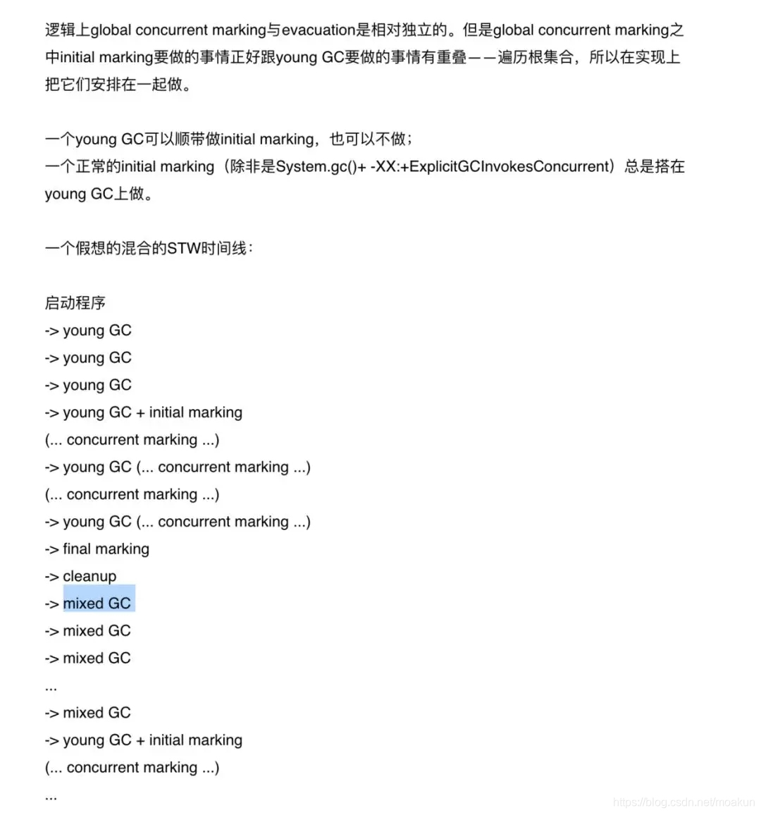 1、初始标记(initial-mark),在这个阶段,应用会经历STW,通常初始标记阶段会跟一次新生代收集一起进行,换句话说——既然这两个阶段都需要暂停应用,G1 GC就重用了新生代收集来完成初始标记的工作。