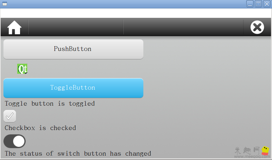 分别设置ViewType为MButton::toggleType,MButton::checkboxType,MButton::switchType,需要设置是否可选通过setCheckable()函数,默认是不可选的。通过connect挂载clicked的行为,clicked会传递是否选中的状态给行为函数。可以通过setChecked(bool)函数来激发以上控件改变状态。