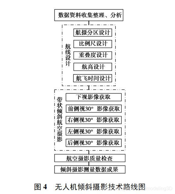 利用无人机飞控系统控制数码相机镜头角度,按照垂直向下、前视 30°、后视 30°、左侧视 30°、右侧视 30°等 5个方向分别获取航空影像数据,形成遗址区带状倾斜摄影测量数据。主要工作有航线设计、航空摄影、航摄数据质量检查等,具体工作流程如图 4 所示。