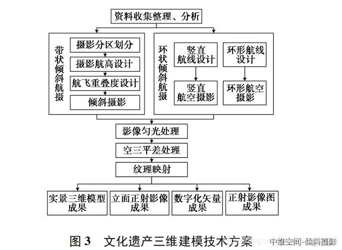 针对文化遗产大场景与重要建筑物的实景三维模型需要不同精细程度的模型的难题,文中对无人机倾斜摄影设计方案进行了优化( 如图 3 所示) ,采用带状倾斜航空摄影+环状倾斜航空摄影的技术方案,得到遗址区的航摄数据,最后融合两种影像数据生成遗产区的实景三维