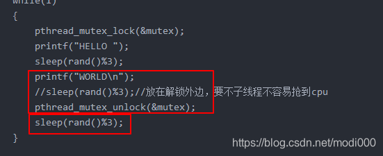 printf这个共享资源使用结束后,立即解锁,另外,sleep放在解锁里边的话,解锁后又继续执行while循环,另一个线程不容易获取cpu,以上两个原因。