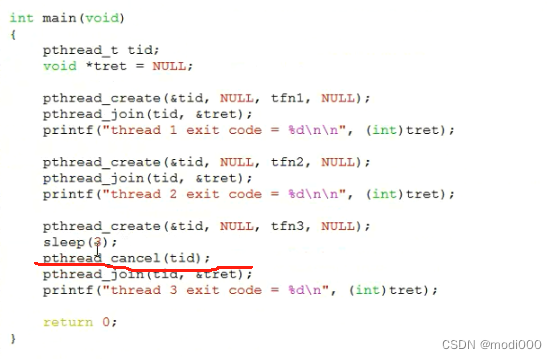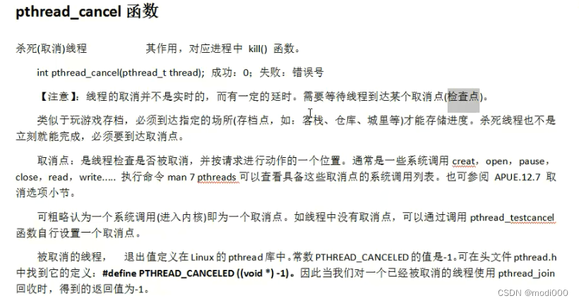 如上图所示,线程函数中没有取消点(一般是一些系统调用----man 7 pthreads查看,自定义函数是无效的),则使用pthread_cancle函数不生效。