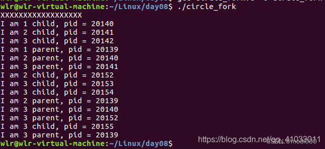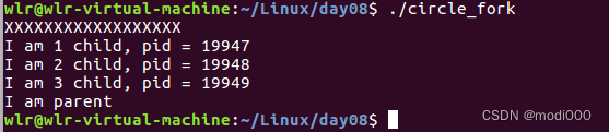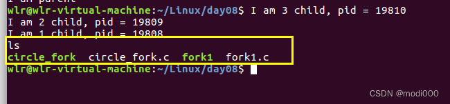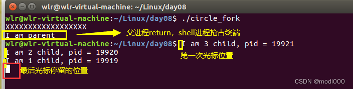 但是shell进程不知道还有子进程,当父进程执行完(打印了 I am parent),shell进程抢占了前台,恢复到正常状态,此时子进程3用了终端,所以这句话( I am 3 child, pid = 19810)就没打印到下一行的行首,而是直接打印到光标的后面的位置上,打印完之后,做了个换行,光标移到下一行起始位置,这时候子进程2又抢占了终端,在光标之后打印了一句话……