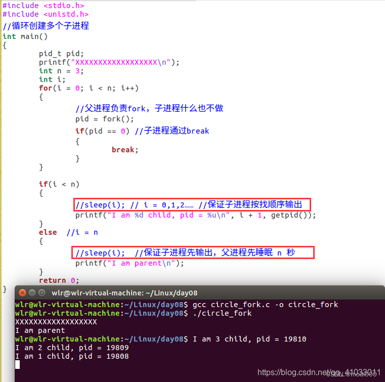 sleep(i); //保证子进程先输出,父进程先睡眠 n 秒